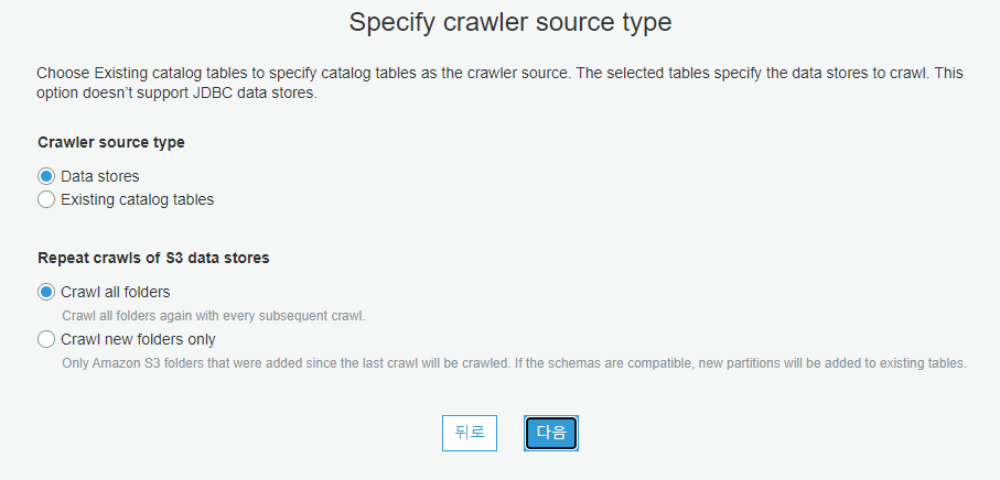 AWS Glue 콘솔 이동 후 Crawler 설정을 진행한다.