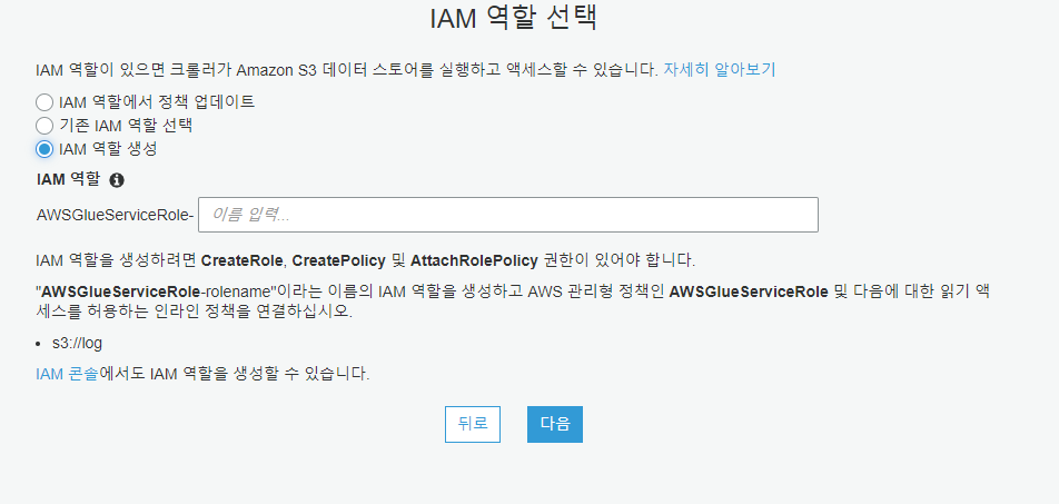 여기서 IAM 역할 생성이 필요하며 네이밍은 본인이 원하는 이름으로 지정하여 생성한다.